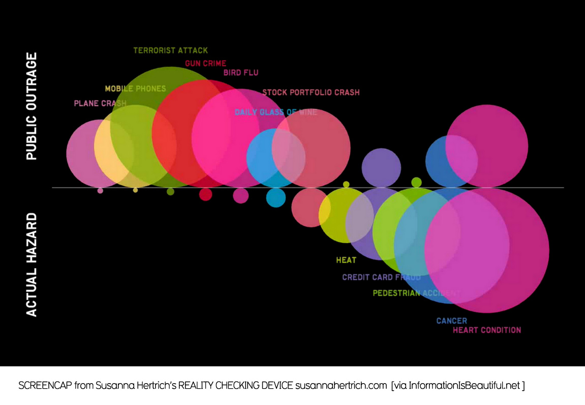 Per rivedere l’attività, ho proiettato l’immagine (abbastanza famosa) di Susanna Hertrich, del 2008, “Reality Checking Device”, dove l’area di alcuni cerchi permette un confronto visivo immediato tra il rischio reale e quello percepito.